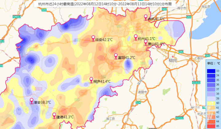 记者查询杭州市气象台官网看到,过去24小时(8月12日14时10分-8月13日14时10分)杭州市区最高温为41.1℃,大杭州范围内,临安区的最高温则达到了42.1℃!