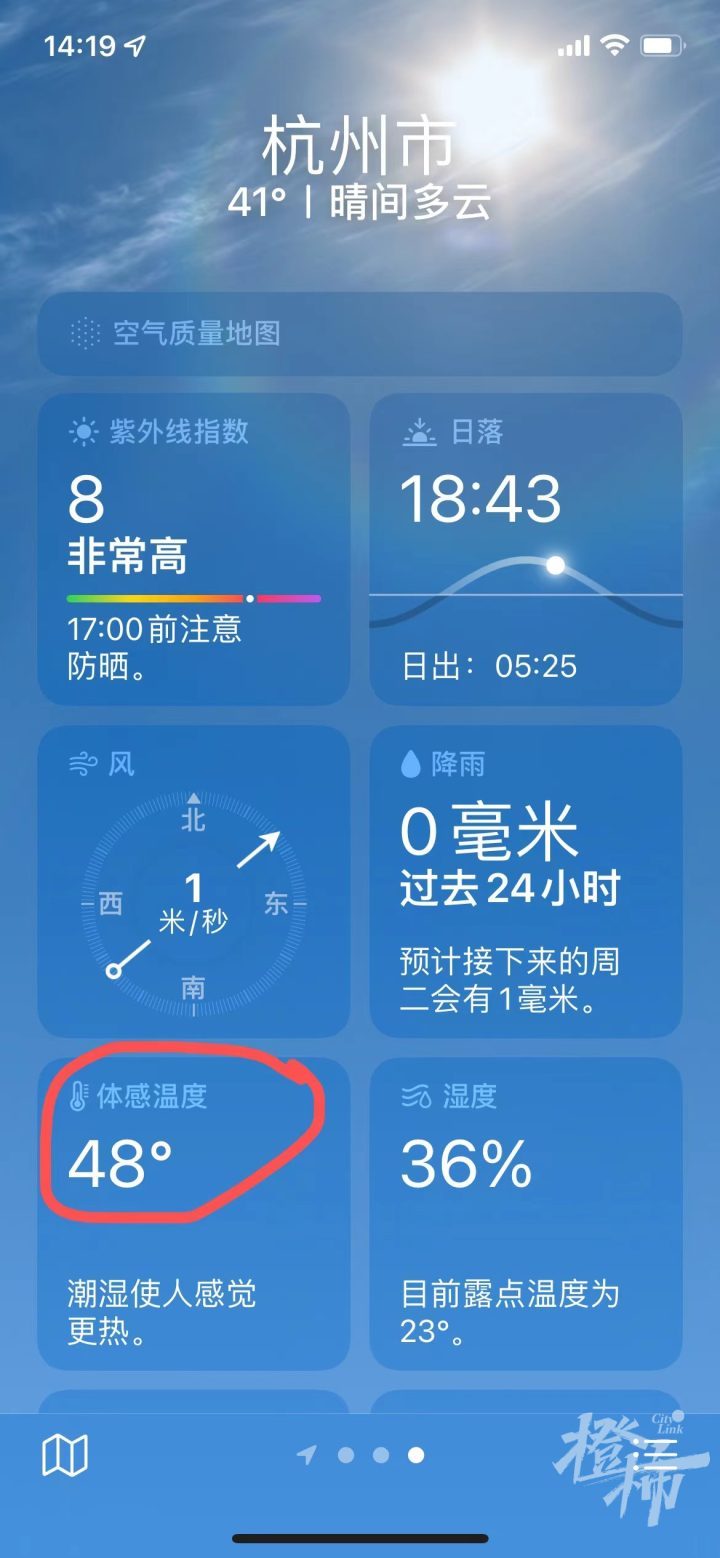 另据苹果手机自带的气象软件显示,今天下午2点左右,人体体感温度已达48℃,真的让人要热昏了~