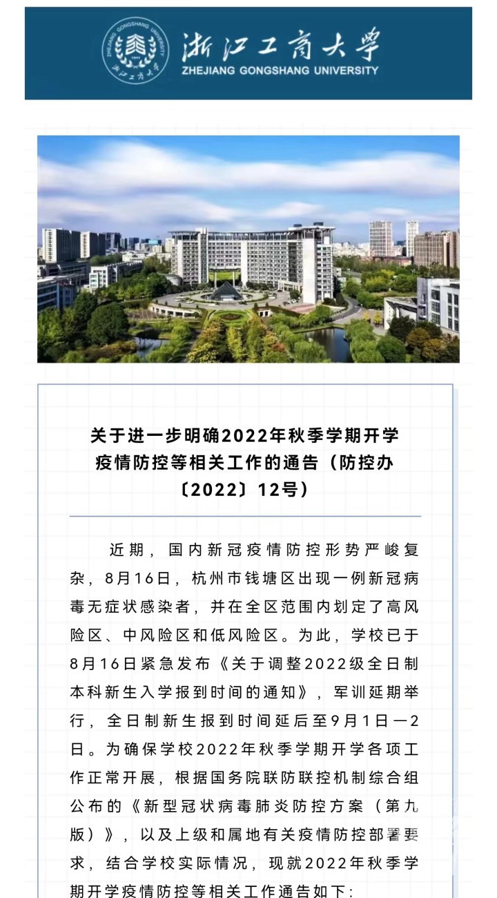 浙江工商大学宣布新生报到延迟,并且延迟军训。