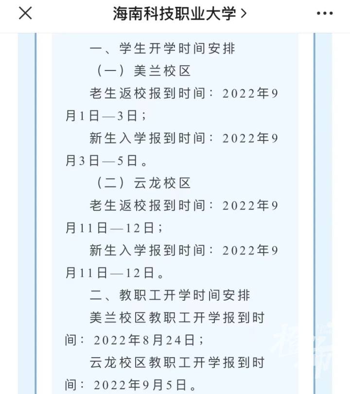 对2022年秋季学期美兰校区开学时间作相应调整,云龙校区开学时间不变。