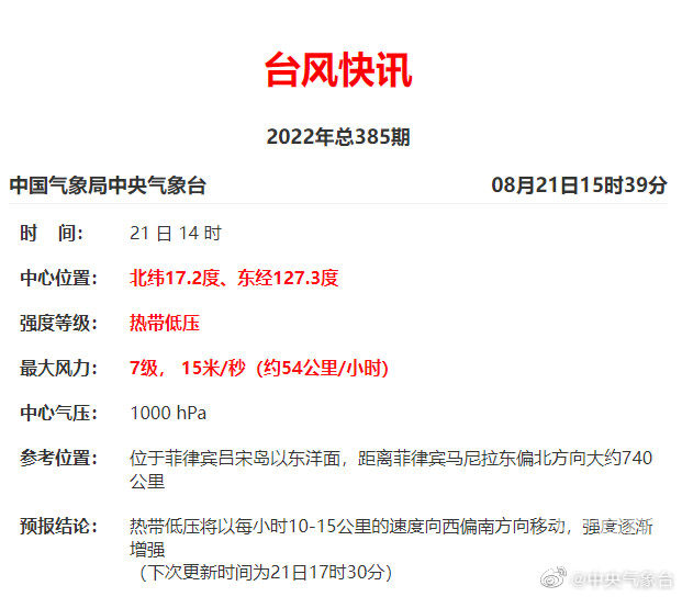 下午15:39,中央气象台发布台风快讯,菲律宾吕宋岛以东洋面,有热带低压生成!