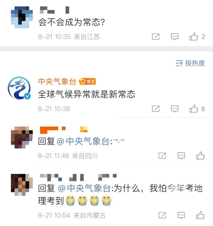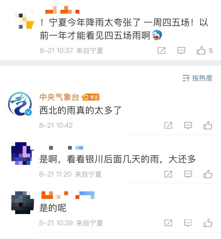 宁夏的网友向中央气象台哭诉:“宁夏今年降雨太夸张了,一周四五场!以前一年才能看见四五场雨啊。”还有网友问,这会不会成为常态?中央气象台对此淡定地回复说:全球气候异常就是新常态。