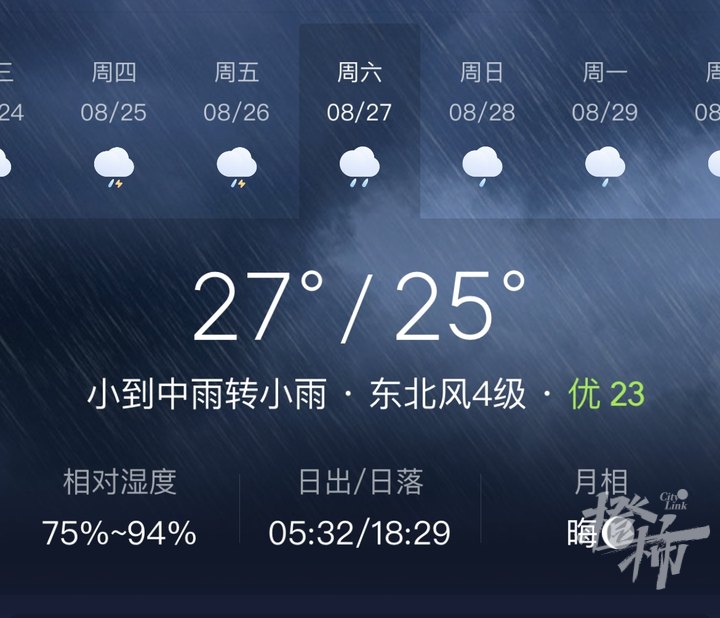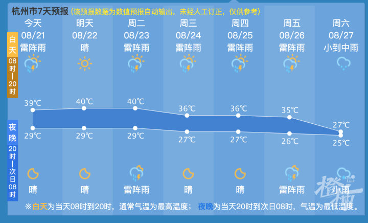 24日~28日杭州至少下两场雨,还有北风和东风轮流吹,加上天空厚厚的云层,杭州气温开始明显的走下坡路。27日以后到8月底,杭州基本上很难再出现超过35℃的高温了,说不定凉爽的日子还可能再提前一到两天。