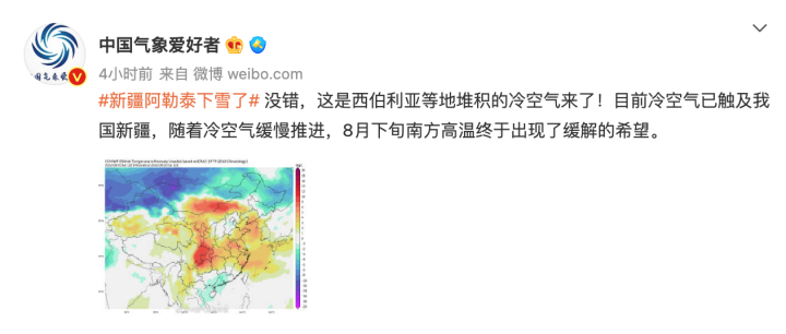 知名科学科普博主中国气象爱好者表示,“没错,这是西伯利亚等地堆积的冷空气来了!目前冷空气已触及我国新疆,随着冷空气缓慢推进,8月下旬南方高温终于出现了缓解的希望。”