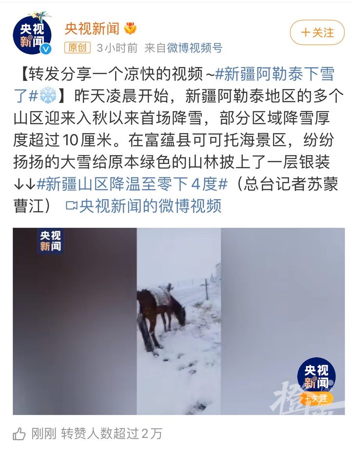 据央视新闻报道,昨天凌晨开始,新疆阿勒泰地区的多个山区迎来入秋以来首场降雪,部分区域降雪厚度超过10厘米。在富蕴县可可托海景区,纷纷扬扬的大雪给原本绿色的山林披上了一层银装。