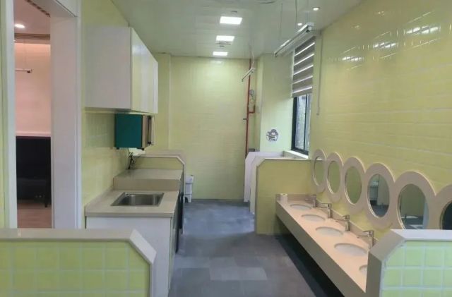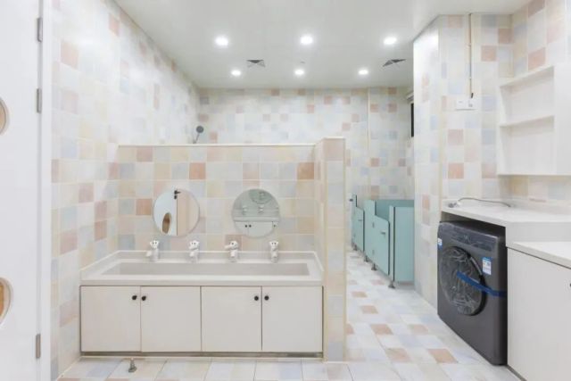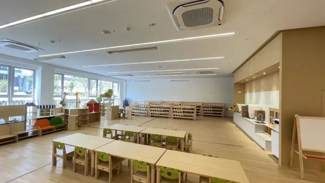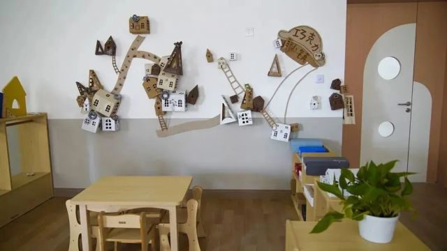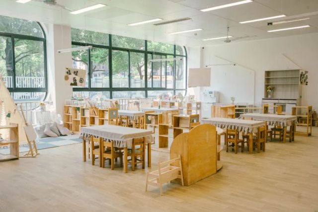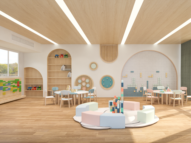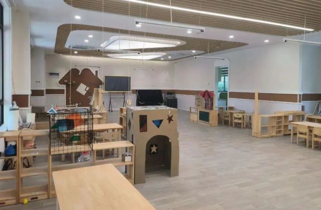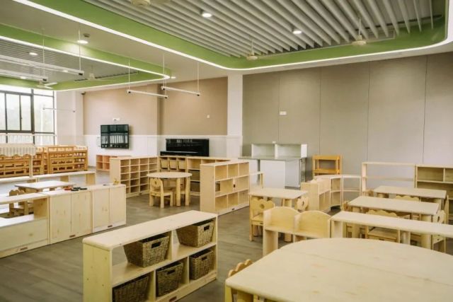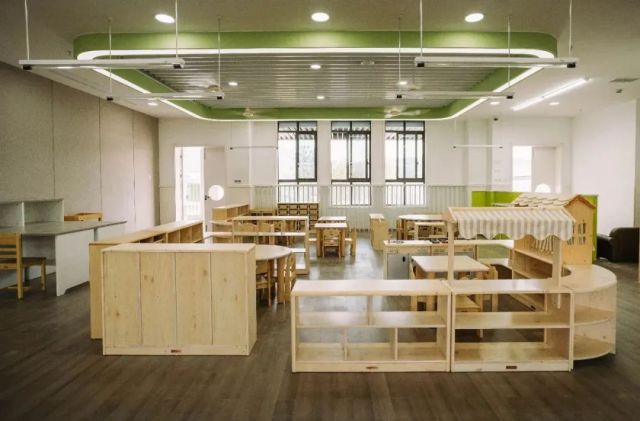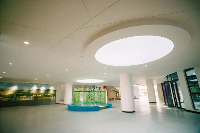 【建设理念】极简的白色外墙,搭配错落的木纹“画框”,幼儿园以“大气”、“简单”为主基调,打造自然典雅的整体风格,给孩子们提供了一个更加温馨、 舒适的校园环境。幼儿园适当扩大了公共区域面积,预留了对外开放和跨班级活动的可能性。