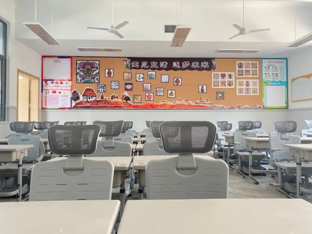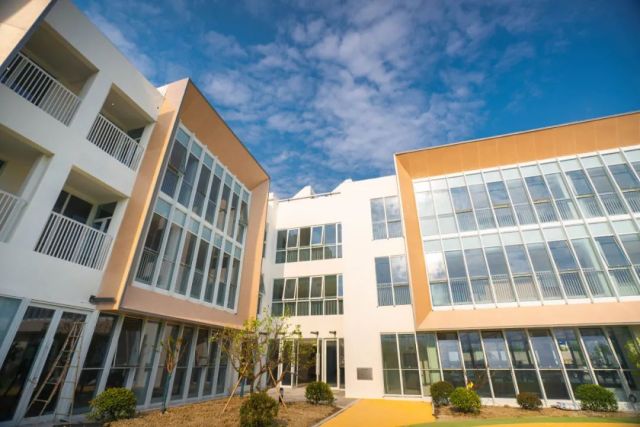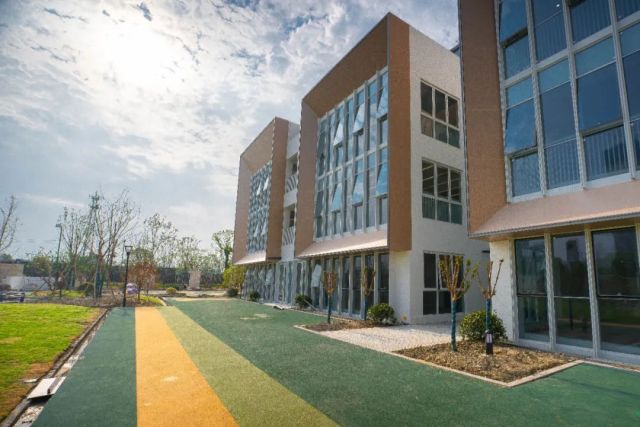 【建设理念】建筑设计风格采用宋韵风格,屋面设计增加了一层斜屋顶、并在屋顶满铺挤塑保温板,除了建筑美观外,二层教室的隔热、保温性能突出。校区设计和施工中注重环保和健康,油漆、木材等装修材料均采用环保级材料,操场跑道采用环保型塑胶材料,全部教室灯光均安装智能护眼灯,全力满足学生入学需求。