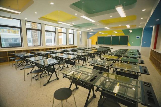 【建设理念】学校在设计理念上追求现代感的建筑精神,通过矩形体块的加减、旋转、穿插,使建筑在体量上高低错落有致,空间丰富,营造出简约、精致、现代的校园整体形象。校内各功能室布局合理,不仅拥有各种专业教室,还拥有图书馆、舞蹈厅、报告厅、体育馆、心理咨询室和队部室等辅助教学用房。