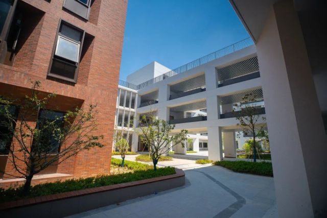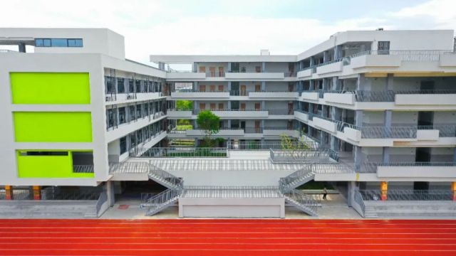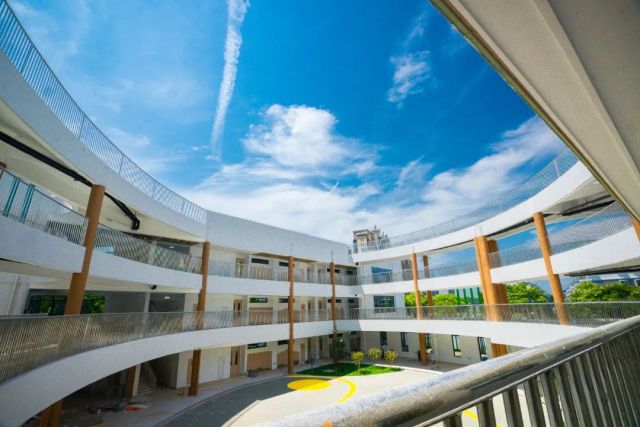【建设理念】该项目建设内容包括教学楼、综合楼、图书馆、多功能馆、环廊、地下室、景观绿化及其他市政配套工程,总投资约2.2亿元。项目设计引入“校园活力环”的概念,打破传统学校非室内即室外的边界,为孩子们创造一个集数学、交流、休憩、运动、生态等多重功能于一体的立体的、自由的、开放的乐园。