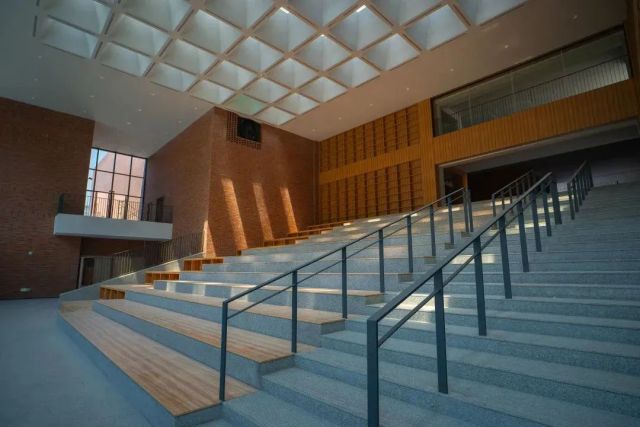 【建设理念】学校建筑以良渚文化特色中的“水、城、玉”为灵感,以中国传统色——水墨色为主色调,加之以苍黄、胭脂红等色彩,呈现出清净雅致的风采。校内“鱼骨状”式校园空间结构,利用一条交通主线(连廊)将不同的功能区域串联起来,形成结构清晰的开放式布局模式。在保证教学空间和活动场地之间独立性的同时,还能满足较为完整的教学复合功能。