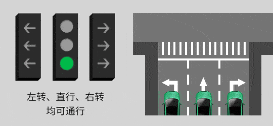 中间亮绿灯,左转、右转灯均不亮时: 三个方向都可以通行;