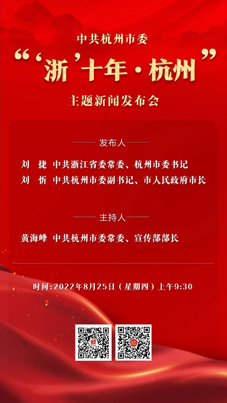 中共杭州市委“‘浙’十年·杭州”主题新闻发布会,将于2022年8月25日9:30举行。本场发布会的主题为“奋进新时代,建设新天堂”。届时,中共浙江省委常委、杭州市委书记刘捷,中共杭州市委副书记、市人民政府市长刘忻将出席发布会,介绍党的十八大以来,杭州牢记习近平总书记的嘱托,贯彻党中央和省委决策部署,坚定不移推进“八八战略”在杭州的具体实践,推进经济社会发展取得的历史性成就,发生的历史性变革,并答记者问。发布会由中共杭州市委常委、宣传部部长黄海峰主持。