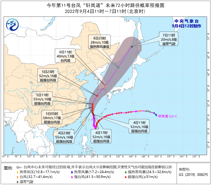 今天11时15分,中央气象台发布台风快讯。9月4日11时,“轩岚诺”距离浙江省朱家尖岛南偏东方向约460公里,北纬26.2度、东经124.5度。强度等级为超强台风级,最大风力为16级, 52米/秒(约187公里/小时)。