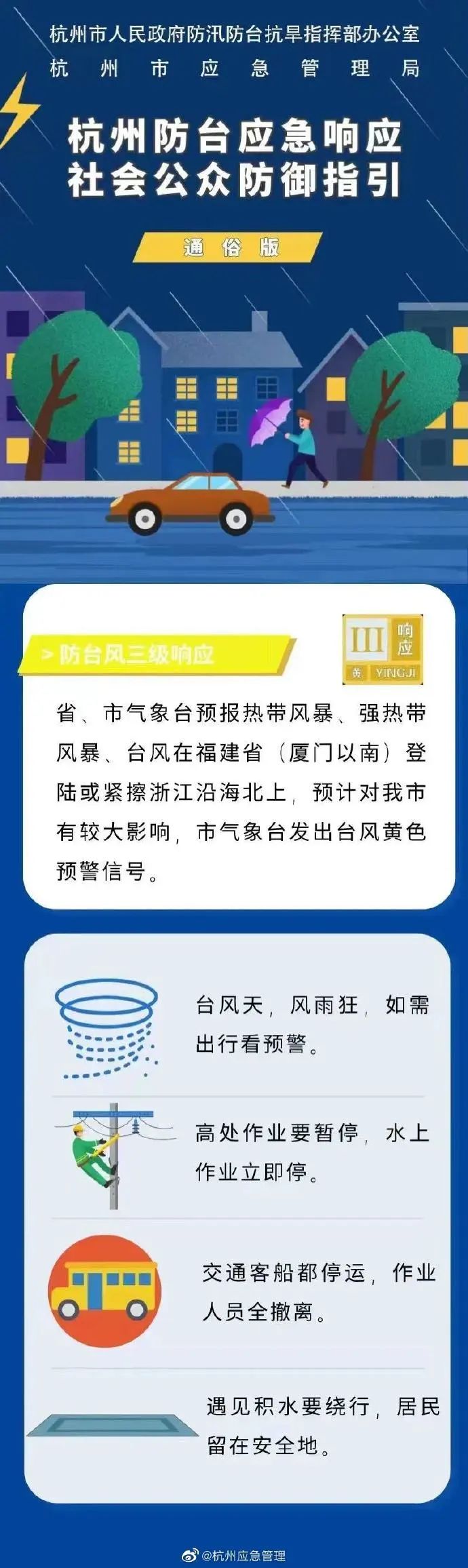 今天上午,中央气象台继续发布台风黄色预警信号,杭州市防指将防台风应急响应提升至III级,杭州市林水局启动水旱灾害防御III级应急响应。今天白天到夜里杭州部分地区有大雨、暴雨,可能引发城乡积涝和山体滑坡等灾害,请注意防范!