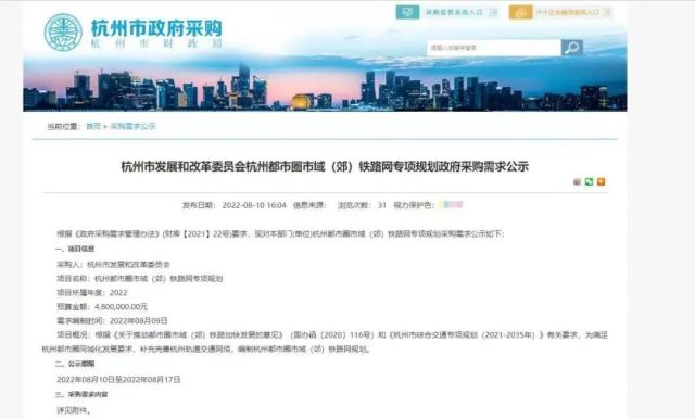 在杭州市政府采购网上,一个“杭州都市圈市域(郊)铁路网专项规划采购需求公示”,前几天结束了公示。