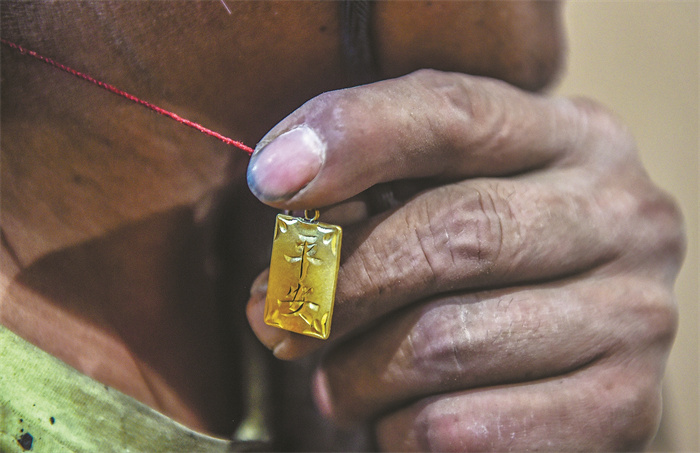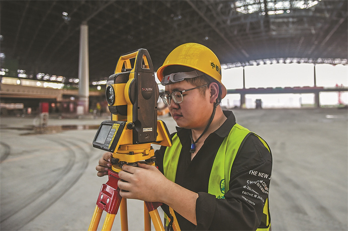 火车站候车层的样板间内,来自河南周口的防水工田新礼正在装修施工,他随身佩戴着一块刻有“平安”的吊坠,这是全家人的祝愿。