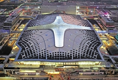 9月6日晚,杭州西站枢纽进行灯光调试。夜幕下,镶嵌在站房屋顶的天窗犹如一只海星,不断变幻着色彩。