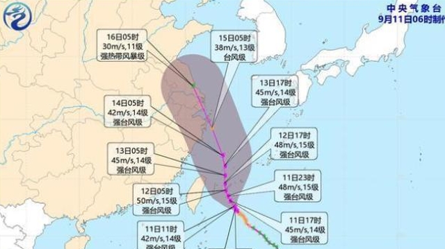 大风预报:9月11日8时至12日8时,东海南部海面、台湾海峡、台湾以东洋面、巴士海峡、我国台湾岛沿海、钓鱼岛附近海域有6—7级大风,阵风8—9级;东海东南部海域和台湾以东的部分海域有8—11级大风,“梅花”中心经过的附近海面和地区的风力有12—15级,阵风可达16级。