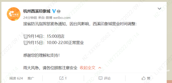 受台风“梅花”影响,杭州西溪印象城发出通告:接省防汛指挥部紧急通知,临时调整商场营业时间,今天(9月14日)下午3点闭店,明天(9月15日)恢复正常营业。