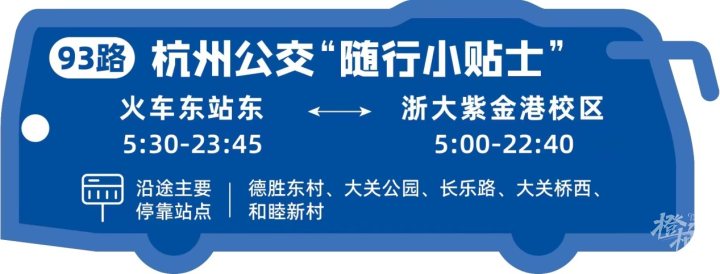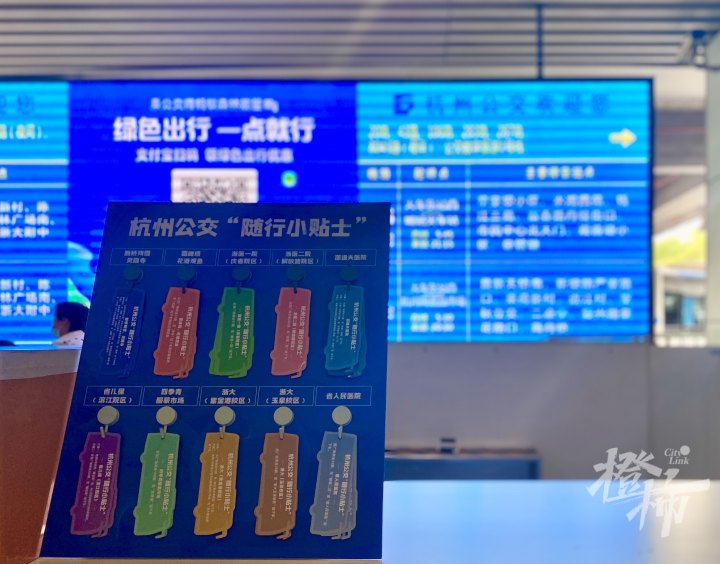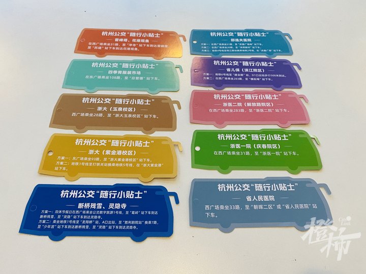 “随行小贴士”是一张“小巴士”造型的小卡片,上面写有从火车东站出发,去杭州市内多个热门出行目的地的公共交通线路指南。