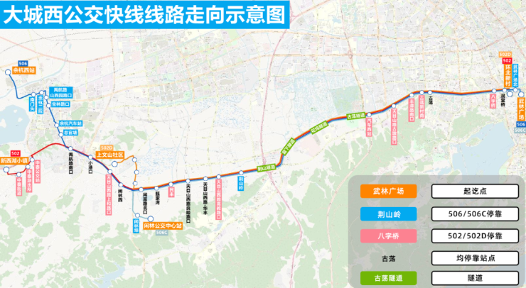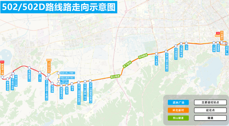 502路由新西湖小镇开往环北新村,从荆山、留下和花坞3个隧道行驶,速度将比以前提升25%。