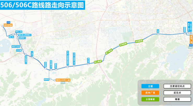 506路由余杭西站开往武林广场,在停靠“荆山岭”后通过荆山、留下、花坞、古荡4个隧道行驶,一站直达古荡,到达古荡后将越过6个站点,直达武林广场。