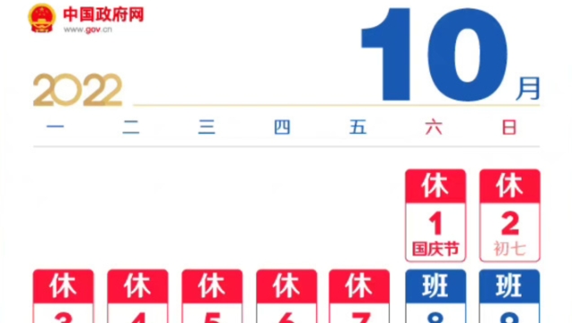 据中国政府网消息,国务院此前发布《关于2022年部分节假日安排的通知》。国庆节10月1日至7日放假调休,共7天,10月8日(星期六)、10月9日(星期日)上班。