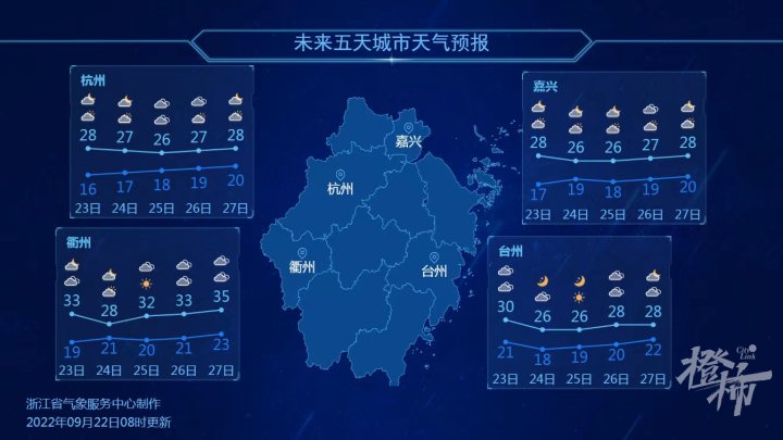 全省也差不多。浙江省气象台预测,未来七天我省以多云天气为主,气温整体平稳,相对湿度较低。其中24日受弱冷空气影响气温小幅下降,25日起副高加强温度逐步回升。
