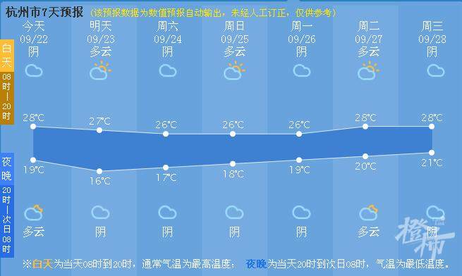 杭州市气象台预计28日前我市以多云天气为主,阳光总体不错,其中明天中午开始有弱冷空气影响,气温舒适宜人,最高气温26~28℃,最低气温18℃左右。近期气温适宜,国庆前杭城的桂花将陆续开放。