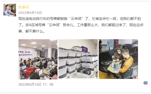 2021年初,钱春花和同事迎来了职业生涯中最忙碌的时刻。当时,杭州正式发放浙A区域号牌,并历史性地推出了“云申领”的线上服务。“云申领”的出现意味着,申请区域号牌的市民只需要在线上提交材料和申请,审核通过后就能在家等车牌快递上门。这一举措对于新车车主来说是轻松了,一次都不用跑,可对于车管所来说,压力陡增。机动车号牌“云申领”在全国是首创,没有经验可借鉴,如何顺利完成申领流程,只能摸着石头过河。车管所临时成立了网办中心,根据职能分组,经验老到的钱春花自然成了中心的骨干力量。