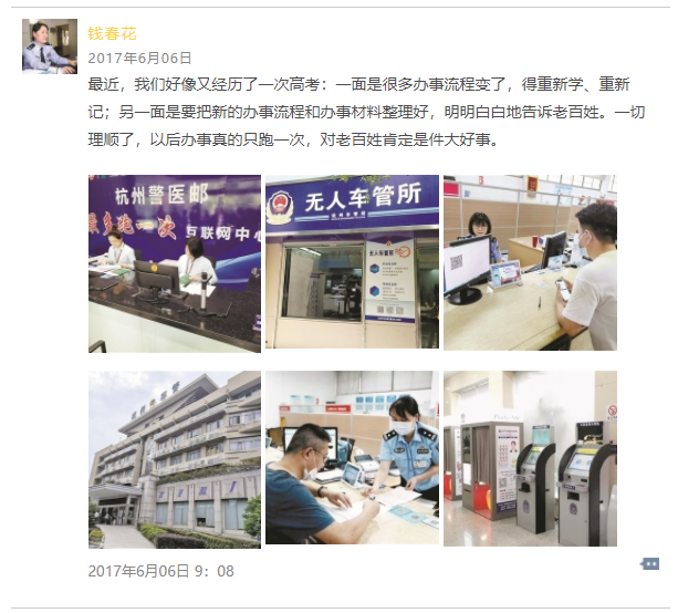 2016年底,浙江省在全国率先提出并实施了“最多跑一次”改革。车管业务与老百姓日常出行极为贴近,坐在办事窗口的钱春花明显感觉到,那时起,自己的工作出现了巨大的变化。“很多业务只要跑一个窗口就能办好,有些业务甚至跑都不用跑。”她说,“用更少的时间和精力就能把事情办好,材料也‘减负’了,对老百姓来说肯定是好的。”