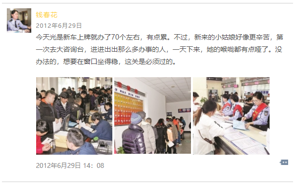 作为杭州交警支队车管所民警,钱春花在古墩路699号工作了19年,她主要的工作是办理如新车上牌、补领行驶证等车管业务,都是和老百姓面对面打交道。而对于这样为老百姓办事的一线工作岗位,现在杭州人习惯用一个词去概括——窗口。