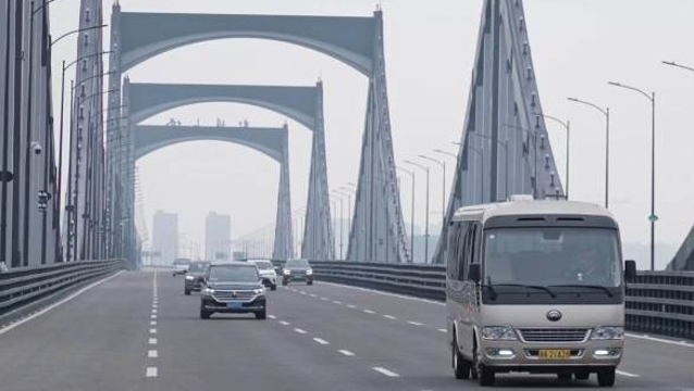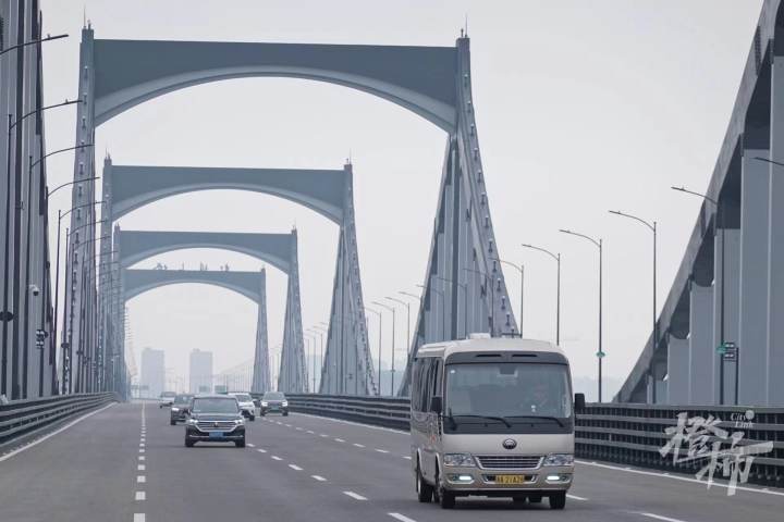 继续向北行驶,就是新彭埠大桥,新彭埠大桥是该项目跨越钱塘江的控制性工程,上层为高架快速路,下层为地铁通道,主桥长1350.8米,是国内首座多跨长联公轨两用钢桁梁桥。桥梁造型提取钱塘江“江潮浪花”的元素,将桥梁外观与钱塘江融为一体,展现了“奔竞不息,勇立潮头”的新时代钱塘江精神。