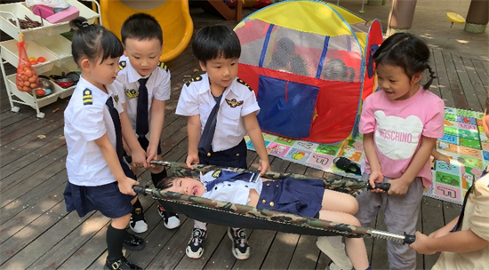 早上一入园,孩子们用红色的爱心卡片点亮了中国地图,红红火火的中国地图象征着我们祖国的繁荣和昌盛。看,操场上整齐的队列的小小解放军们,精神抖擞地正步走来,这是我们中大班的小朋友们,小班的弟弟妹妹们在旁边呐喊欢呼。庄重神圣的升国旗仪式,孩子们一起高唱起了国歌,嘹亮的歌声飘向远方。接下来的游园会,更加让孩子们雀跃,他们俨然成为了一个个小小解放军:学习整齐的叠棉被、学习野外生存、学习受伤后相互救治……孩子们在游戏中体验到了解放军叔叔阿姨们的伟大和艰辛,也在心底更加深了对解放军的敬佩和爱戴之情。