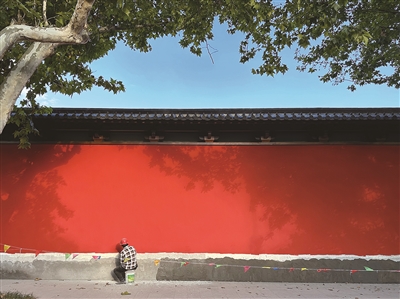 “这个红墙,我们刷第三遍了,昨天刚刚刷完,本来没那么深的,三遍下来,才有了这个颜色。”一位工友边砌砖边说。