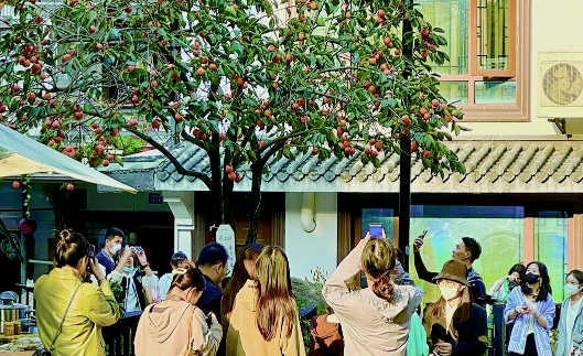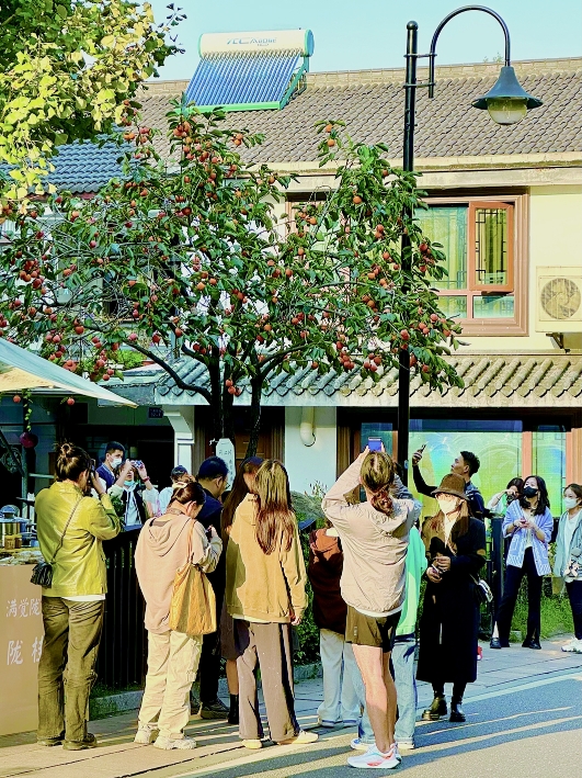 这两天,下满觉陇98号路边有棵柿子树上结满了火红的柿子,非常漂亮,路过的游客都会打卡拍照。 主人特地放了“请勿采摘”的提示牌,但大家都比较文明,只拍照,不动手。