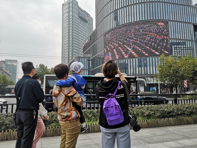 市民驻足武林广场,通过大屏收看党的二十大开幕盛况。