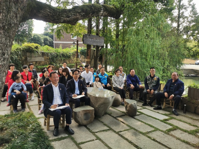 一大早,余杭区径山镇小古城村的大樟树下聚满了村干部、党员、村民代表,大家围坐一起收听收看党的二十大开幕会。