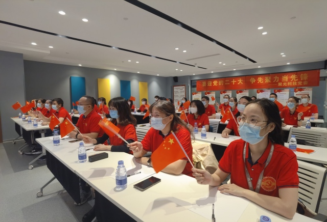在高新区(滨江),聚光科技党委组织收看党的二十大开幕直播。现场,32名年轻的驻杭党员身着红色文化衫,手中挥舞小红旗,看大会盛况,聆听习近平总书记重要讲话。(记者 孟娇 滨江微融圈 徐若雯 )