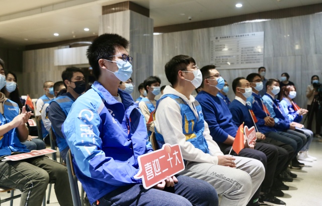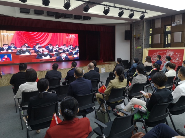 上城区小营巷社区组织党员和各界人士在红巷大礼堂集中收看党的二十大开幕盛况。
