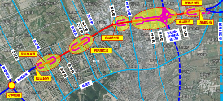 320国道快速路二期为“高架+地面”的设计,双向六车道一级公路标准兼顾城市道路功能,设计速度80公里/小时。全线共设有7对平行匝道、一处综合枢纽,上、下匝道分别为星河路两侧、荷禹路两侧、东湖路两侧各一对,新天路东侧一对,以及与东湖快速路交叉处的东湖互通枢纽。