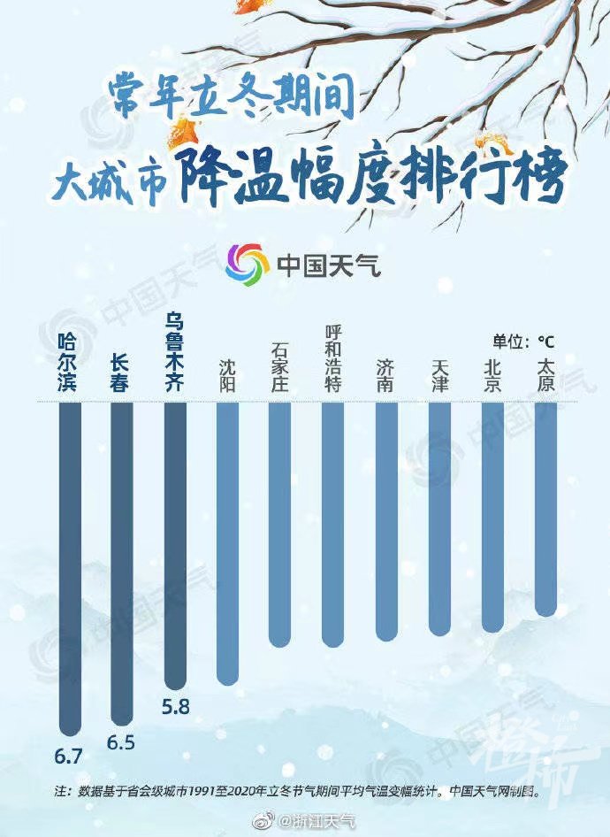 在这个降温最猛的节气里,东北、华北地区的城市气温最容易暴跌。中国天气网通过盘点1991年至2020年省会级城市立冬节气期间平均气温变幅发现,降温排行榜前十全部位于北方,其中哈尔滨位居榜首,降温幅度达6.7℃;长春和乌鲁木齐以6.5℃和5.8℃位列二三位。