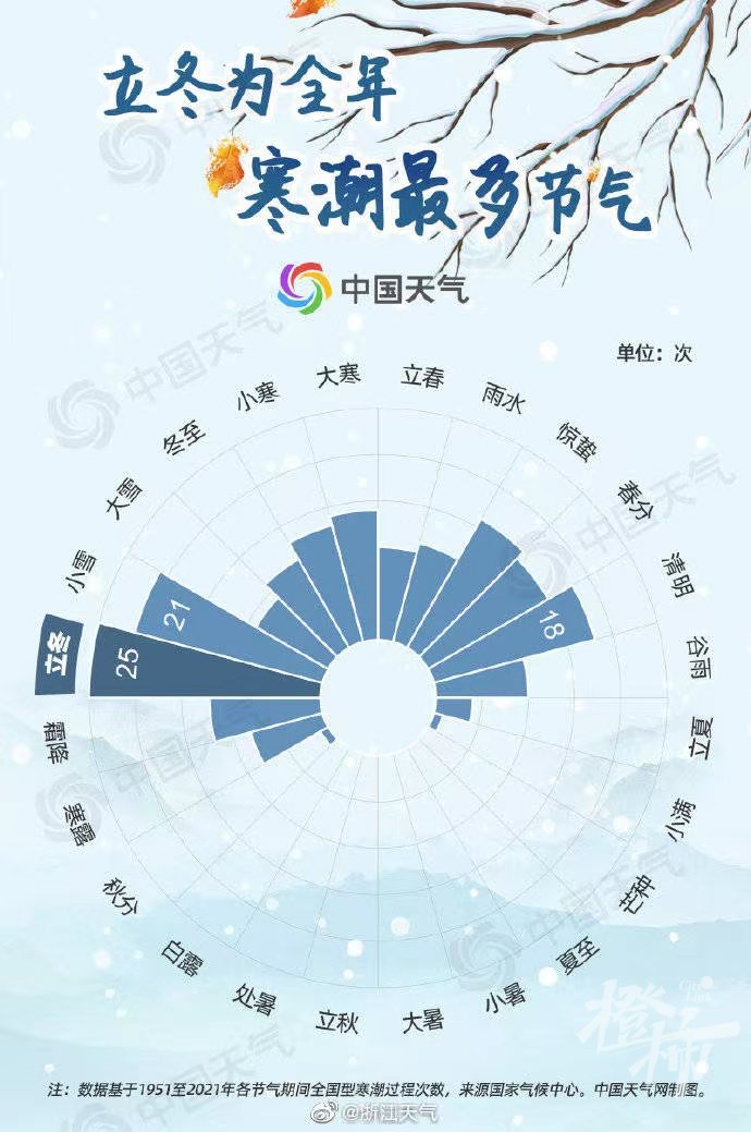 立冬节气期间的冷空气活动更加频繁,实力也更加强劲,通常可南下影响江南甚至华南地区。数据显示,立冬时节是全国型寒潮频次最高的节气,达25次,较上一个节气霜降偏多一倍。