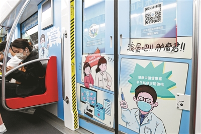 除了王先生,注意到地铁装饰的人不少。有人扫码看起了科普;有人与朋友交流体检筛查事宜;有人表示要调整生活习惯;还有孩子指着车厢上的“小青”“小白”,表达自己的喜爱……
