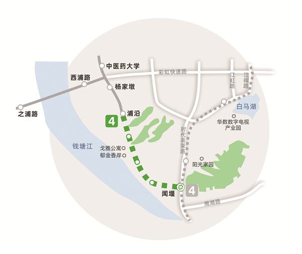 4号线三期工程线路由西延段和南延段组成,西延段起于池华街站(不含),止于云谷站,长5公里,设站4座;南延段起于浦沿站(不含),止于闻堰站,长5公里,设站4座。