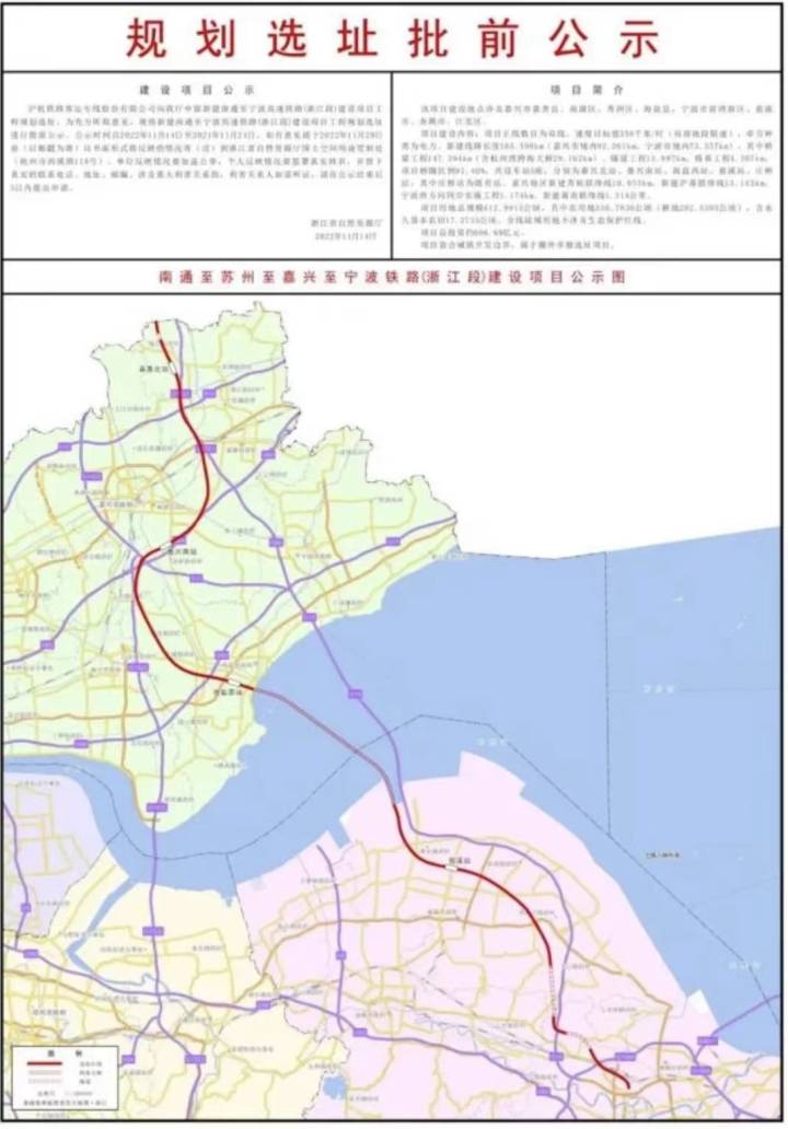 近日,浙江省自然资源厅对新建南通至宁波高速铁路(浙江段)建设项目的规划选址进行批前公示。这意味着一条备受宁波关注的跨海铁路——通苏嘉甬又有了新进展。根据公示,宁波境内新建的慈溪站位置和线路走向进一步明确。