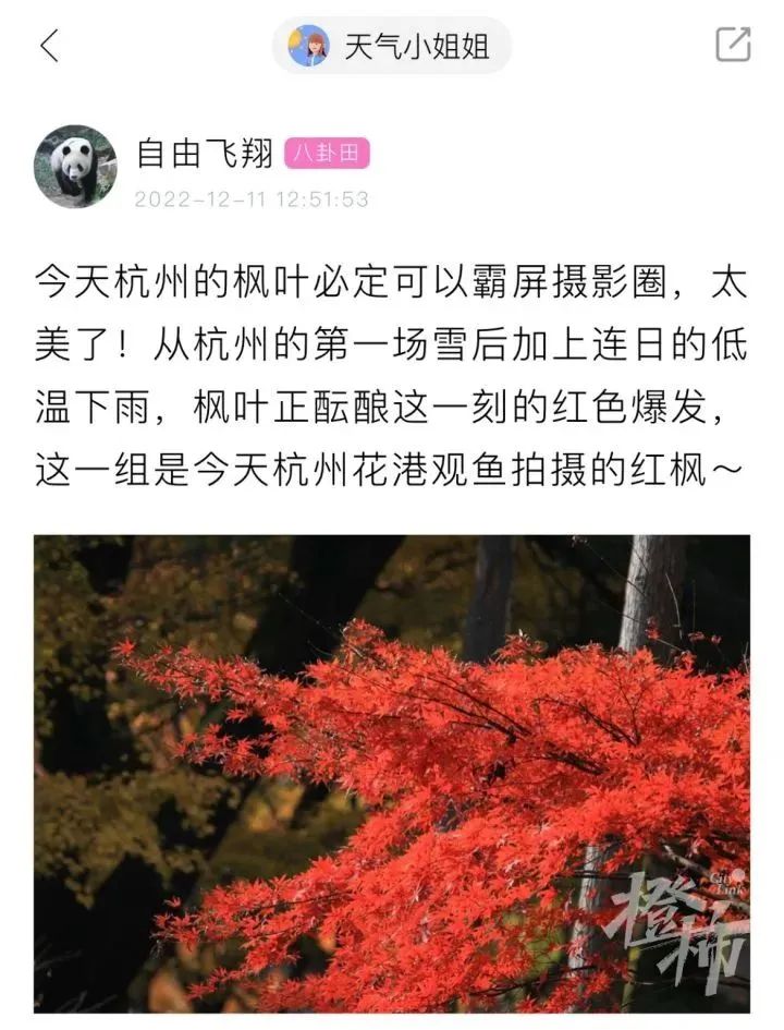 不止西湖边,全城的枫叶都开始红了,橙友“大团圆”感叹说,枫叶红的都像假的了……