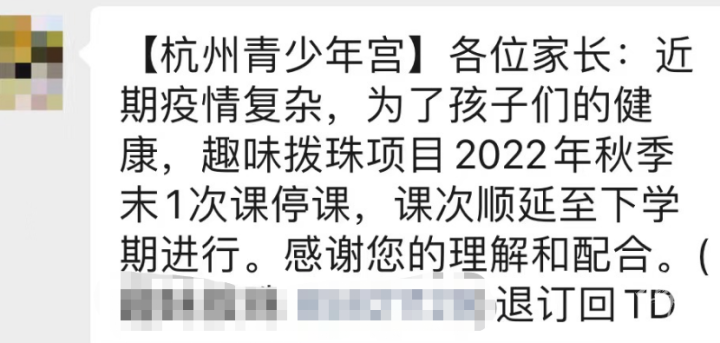 一位小学家长,也收到停课通知,说:“我觉得还是停了好,上节课我就请假没去上了,少年宫上课的孩子,都是全市四面八方来的,我们班有西湖区、拱墅区和上城区的。不去上,减少点交叉感染,安全一些。”