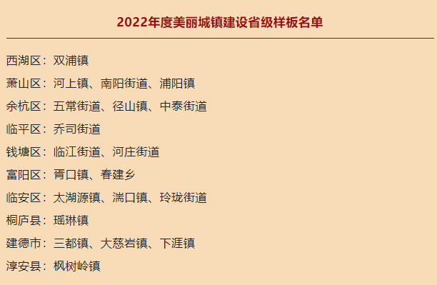 近日,全省美丽城镇2022年度样板创建考核验收结果出炉,杭州20个镇街获评美丽城镇建设省级样板,1个山区县城城镇获评美丽城镇建设山区县县城城镇省级样板。一起来看看,有你的家乡吗?