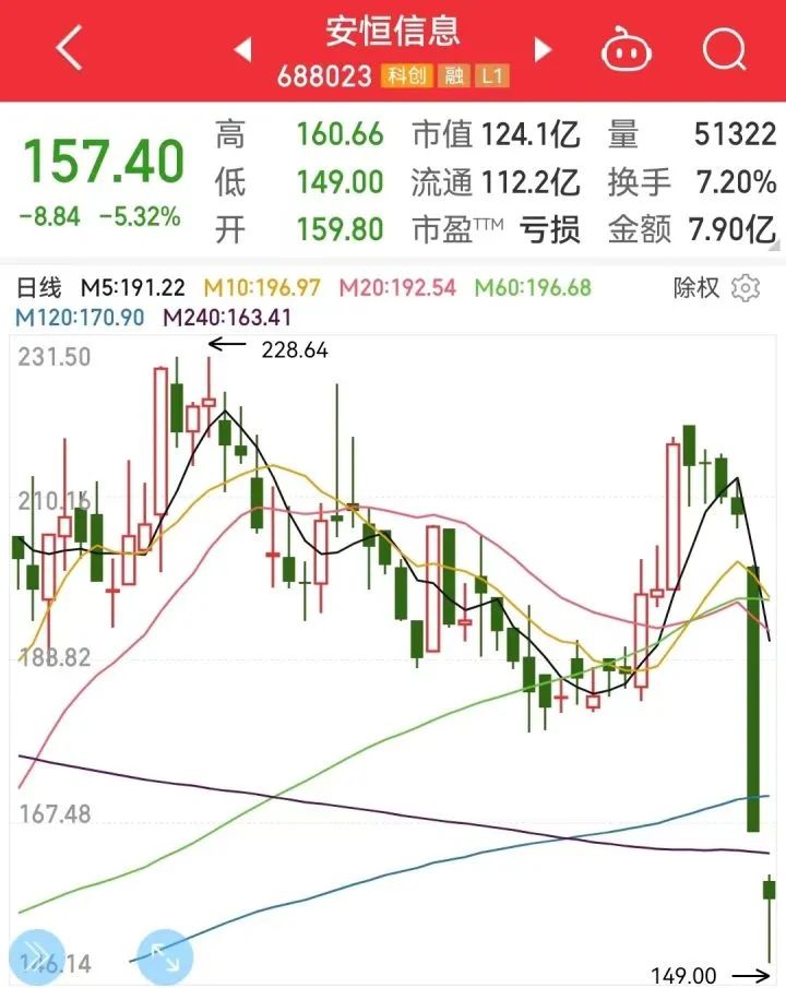 今天截至11点23分,安恒信息跌幅-6.16%,价格为156.00元,市值为123.1亿元,相比1月9日开盘下跌了45元,蒸发了约35亿元。